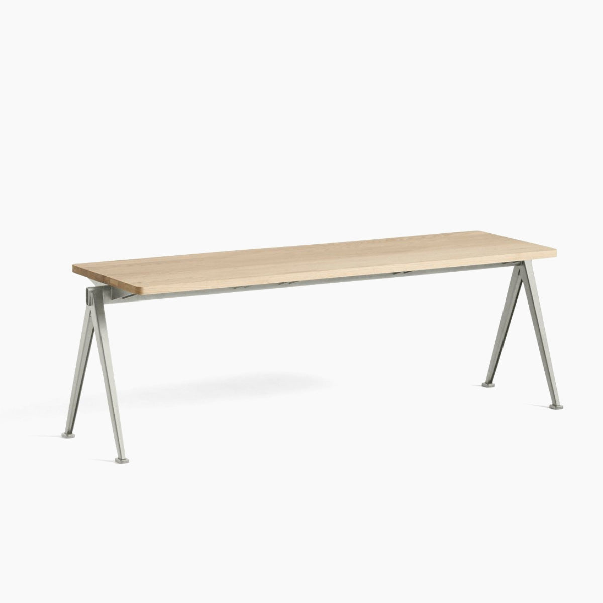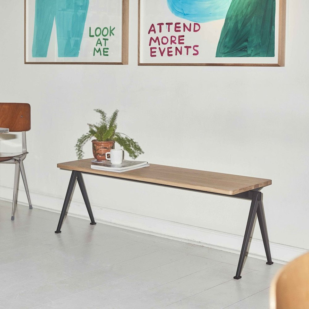 Pyramid 11 by HAY is a bench available in two sizes. The triangle-shaped base is powder coated steel in black or beige. Seat for wood in several types of finishes: varnish, matt varnish, oiled oak, burnt oak.