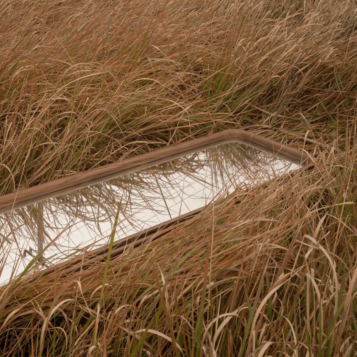 An oblong mirror from the Utility collection designed by the Neri&Hu duo for the Stellar Works brand. The mirror frame is solid wood framed with steel wire covered with electroplated brass. The Utility collection combines comfort with practicality and a sophisticated approach to popular industrial aesthetic.