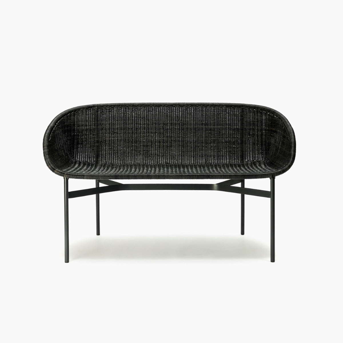 Clara bench from the Feel Good Designs brand with a rounded shape on a graphite base. The rattan seat in natural or black can accommodate two people. Clara is for internal use only. It looks great in any space.