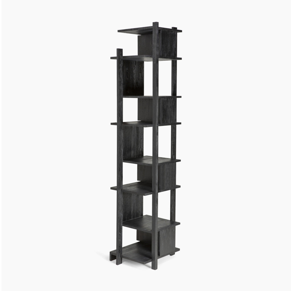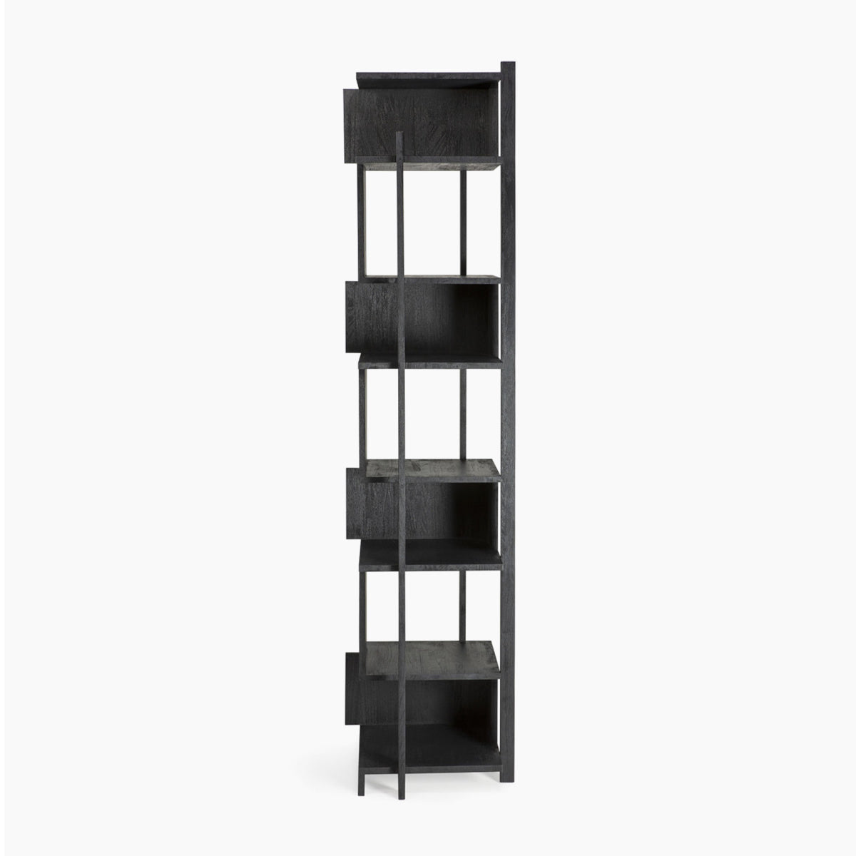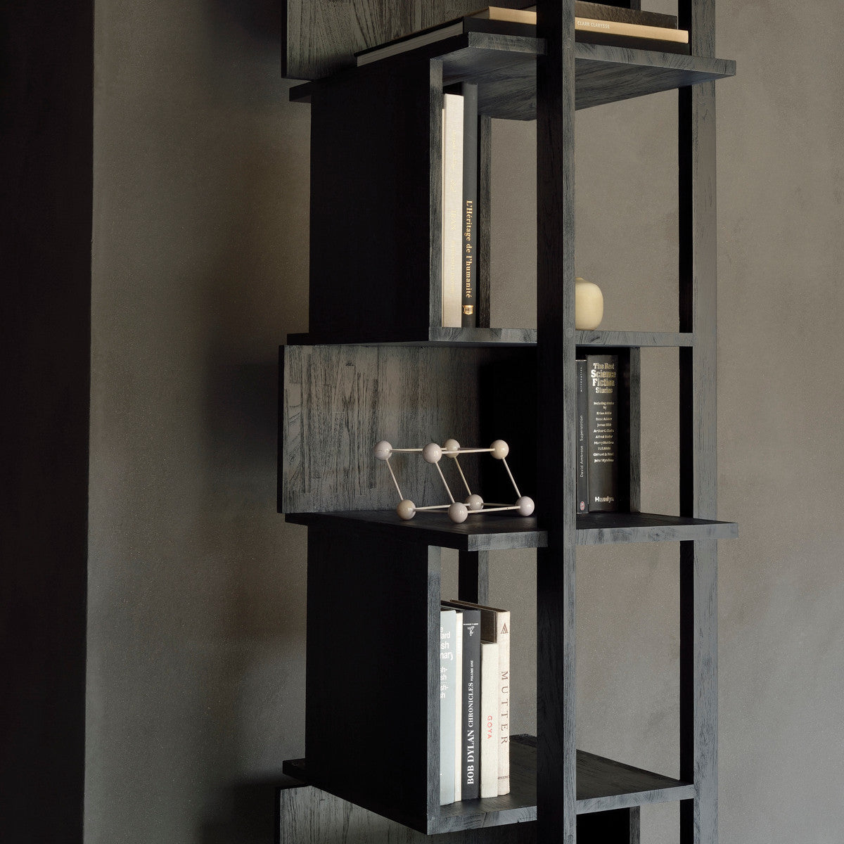 Abstract black column is a tall bookcase made of varnished teak wood in black, FSC certified. As its name suggests, it is in the form of a column. The layout of the shelves resembles three-dimensional objects. The rack will work as a display case.