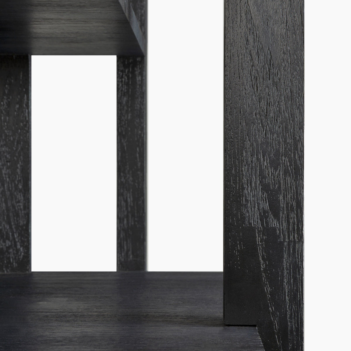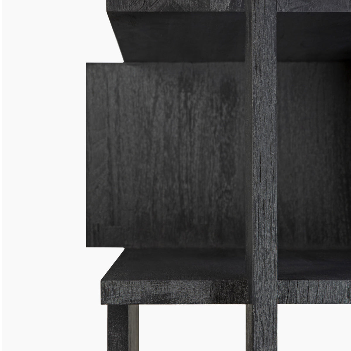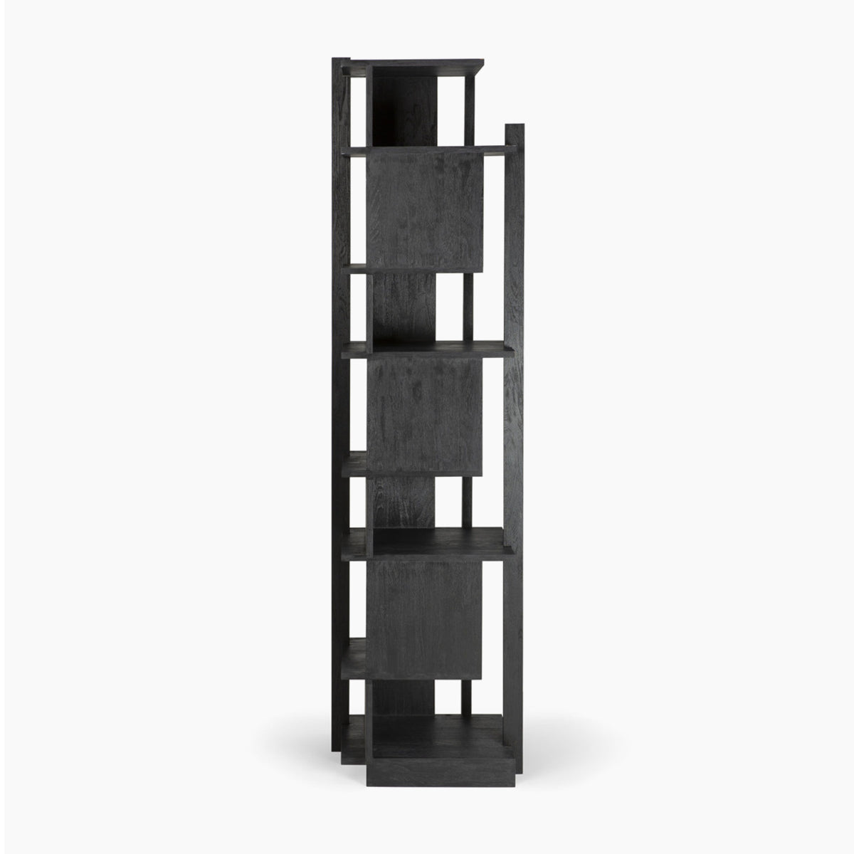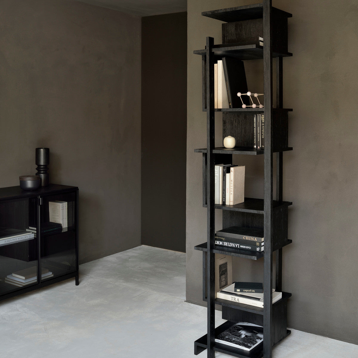 Abstract black column is a tall bookcase made of varnished teak wood in black, FSC certified. As its name suggests, it is in the form of a column. The layout of the shelves resembles three-dimensional objects. The rack will work as a display case.