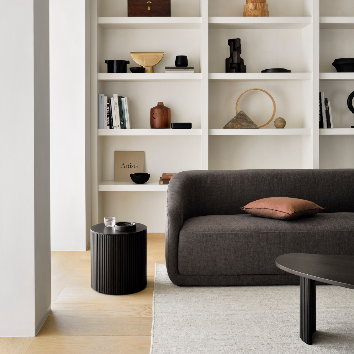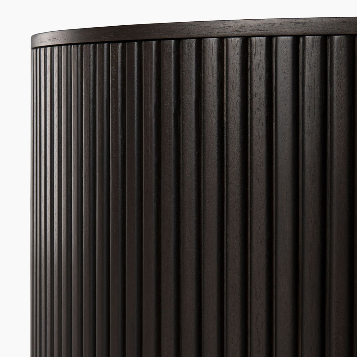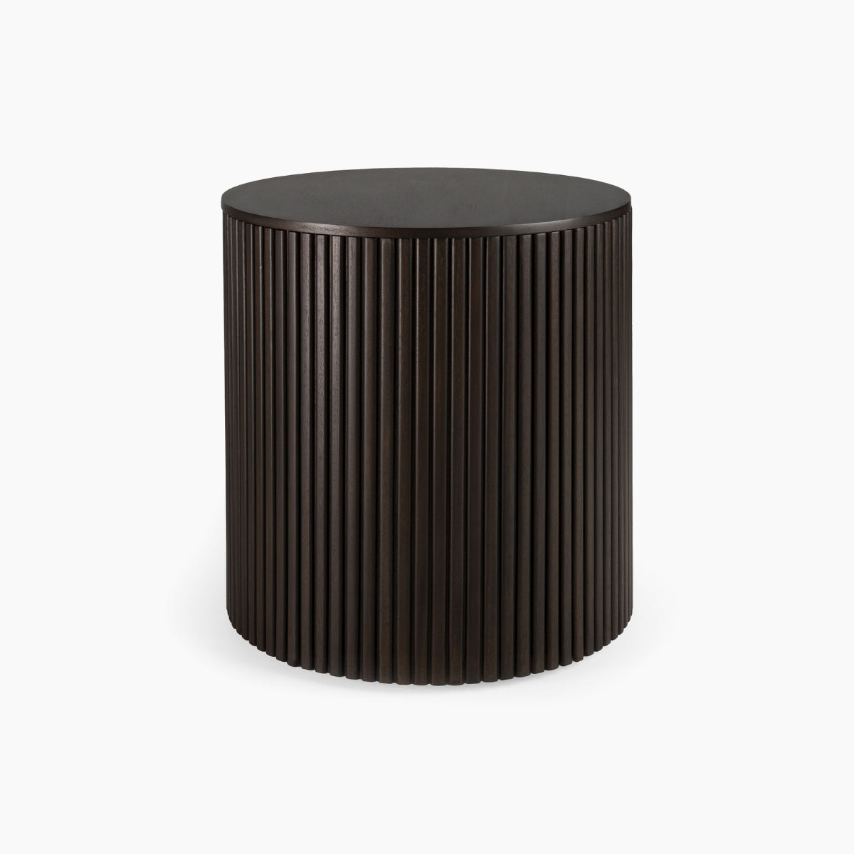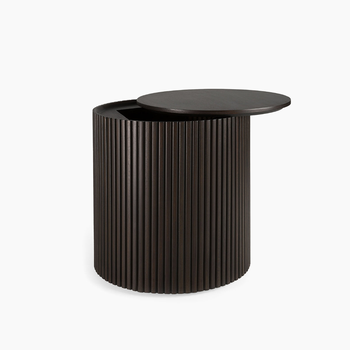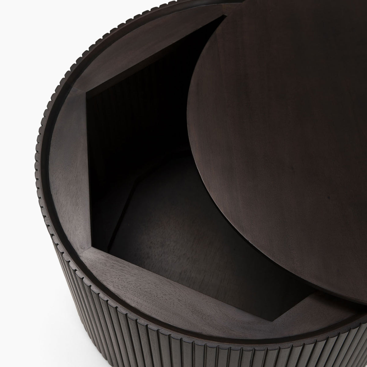 Round, dark brown Roller Max table from Ethnicraft made of varnished mahogany wood. It is distinguished by a removable top under which there is a capacious storage. The side walls of the table emit rungs that perfectly match the delicate texture of the table top. Mahogany wood is hard, durable and resistant to weather conditions. With proper care, it will serve for many years.