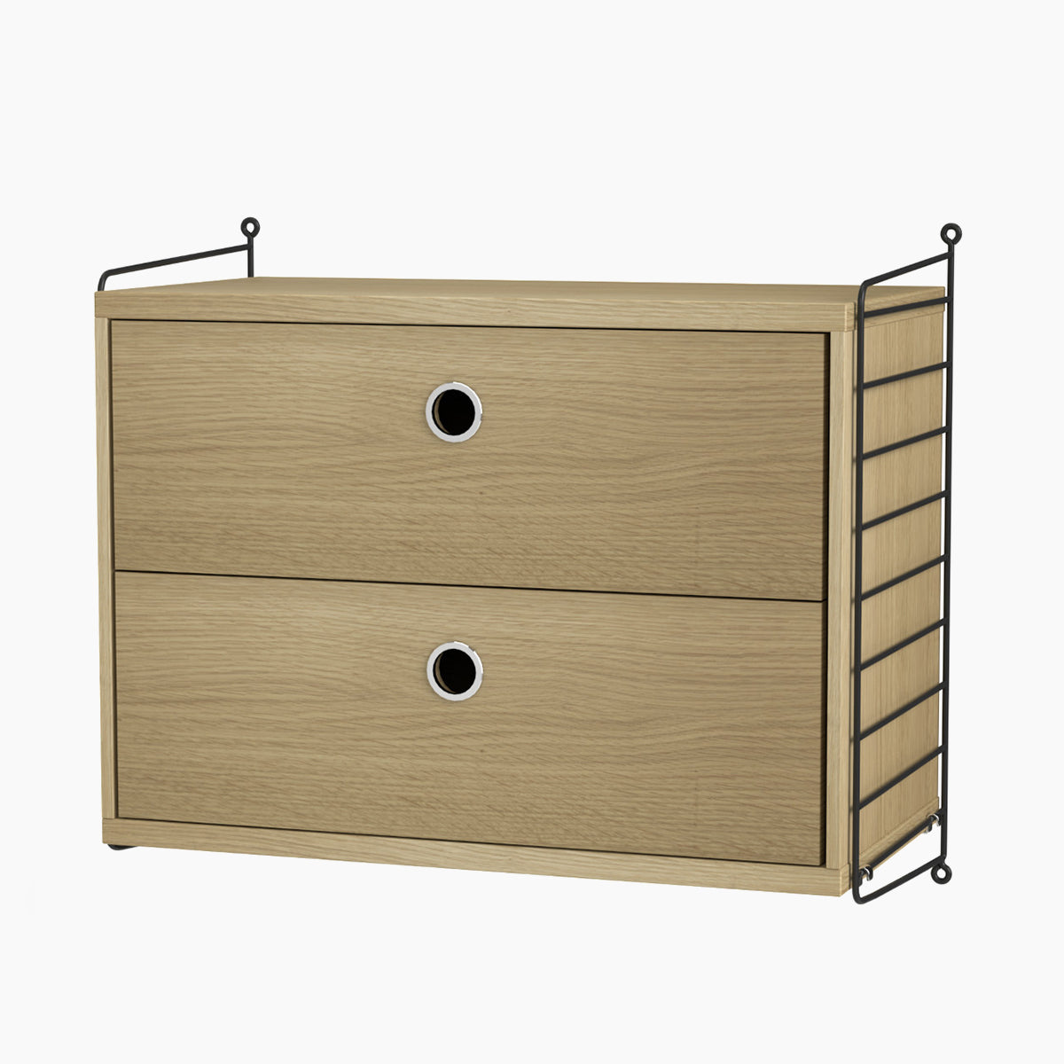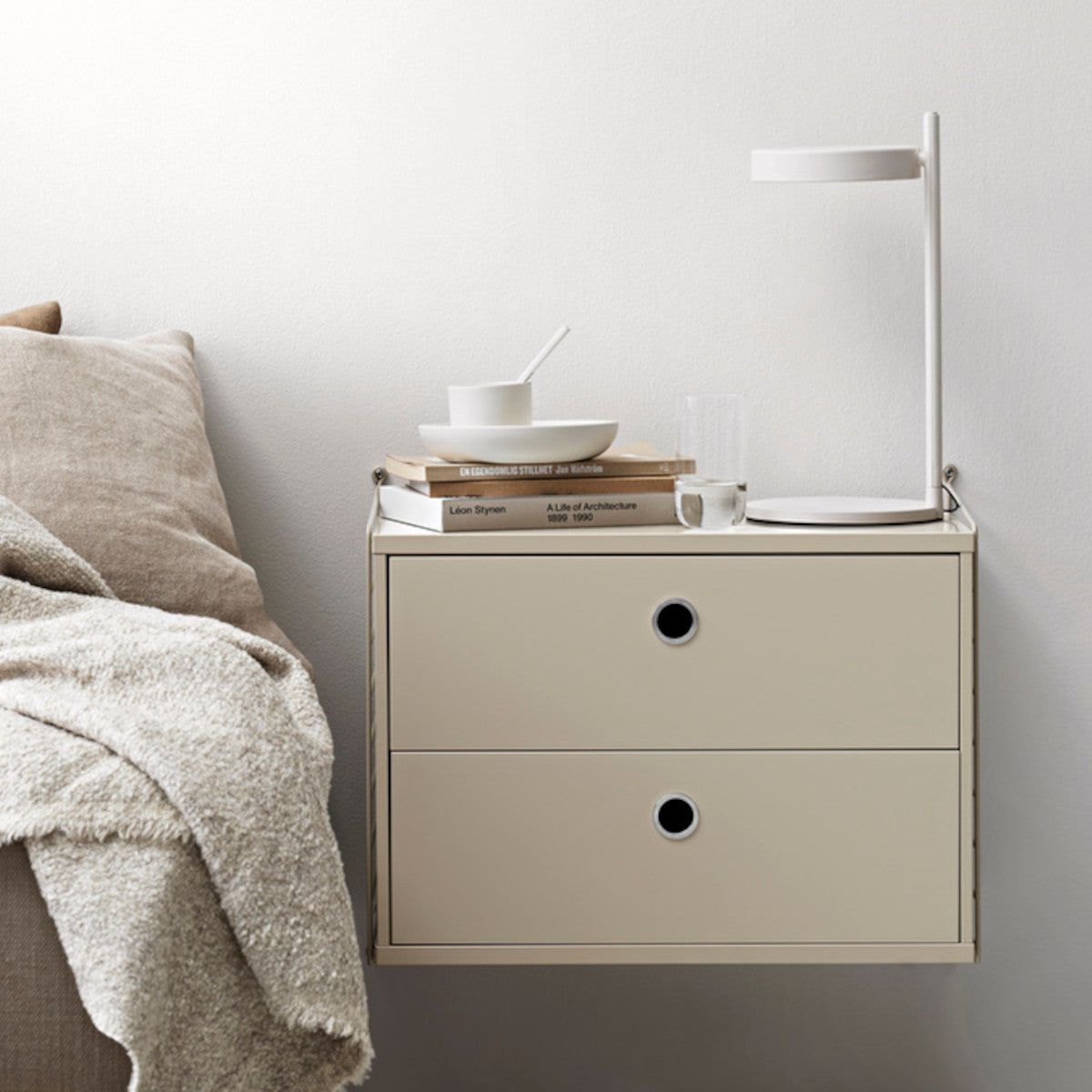 Wall-mounted bedside table from the Bedroom collection by String. The system is perfect for a minimalist bedroom. Panels made of steel, available in several colors. Chest of drawers with two drawers made of oak veneered chipboard.