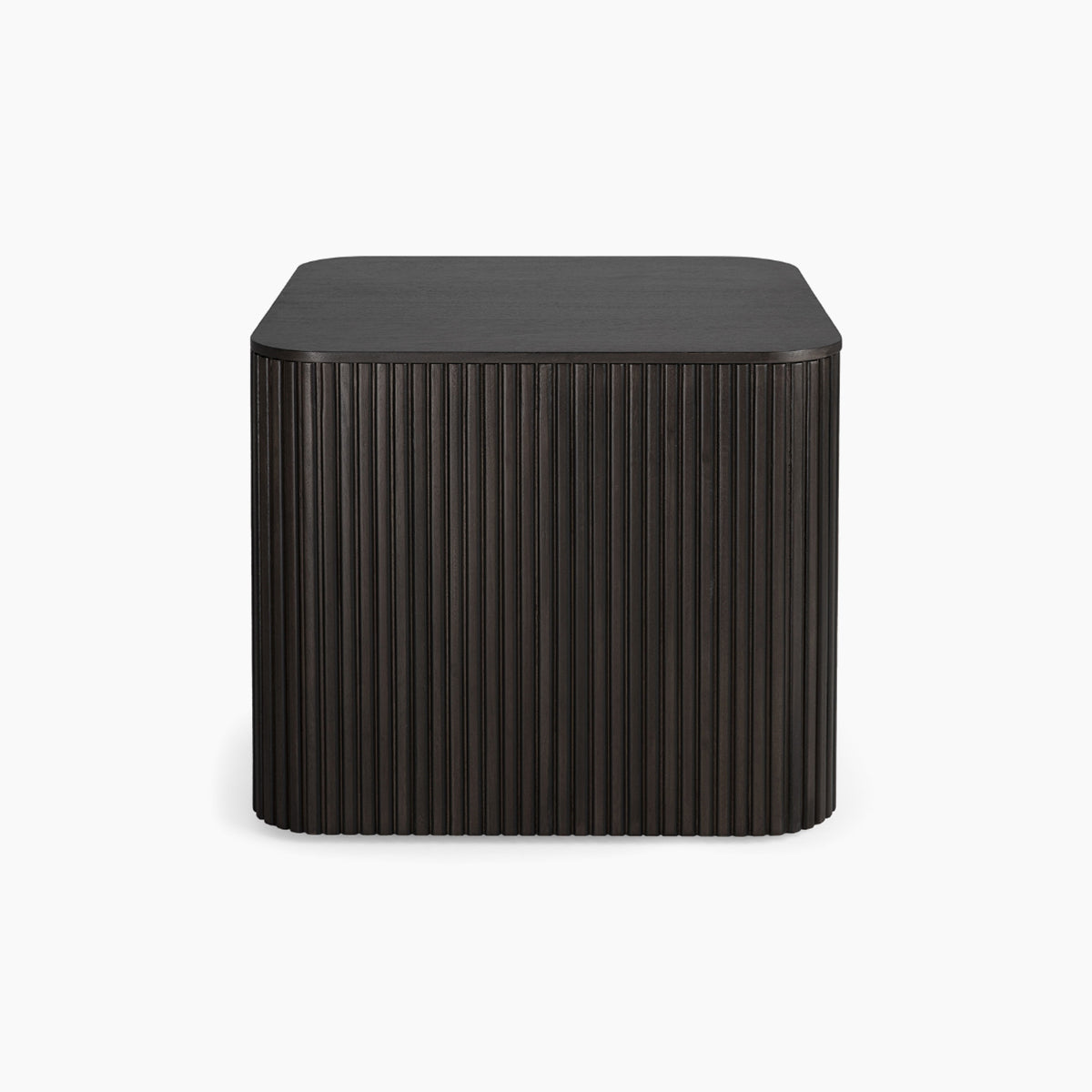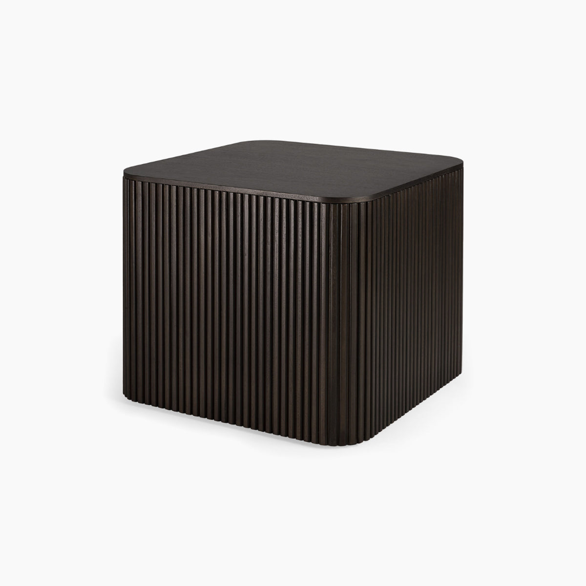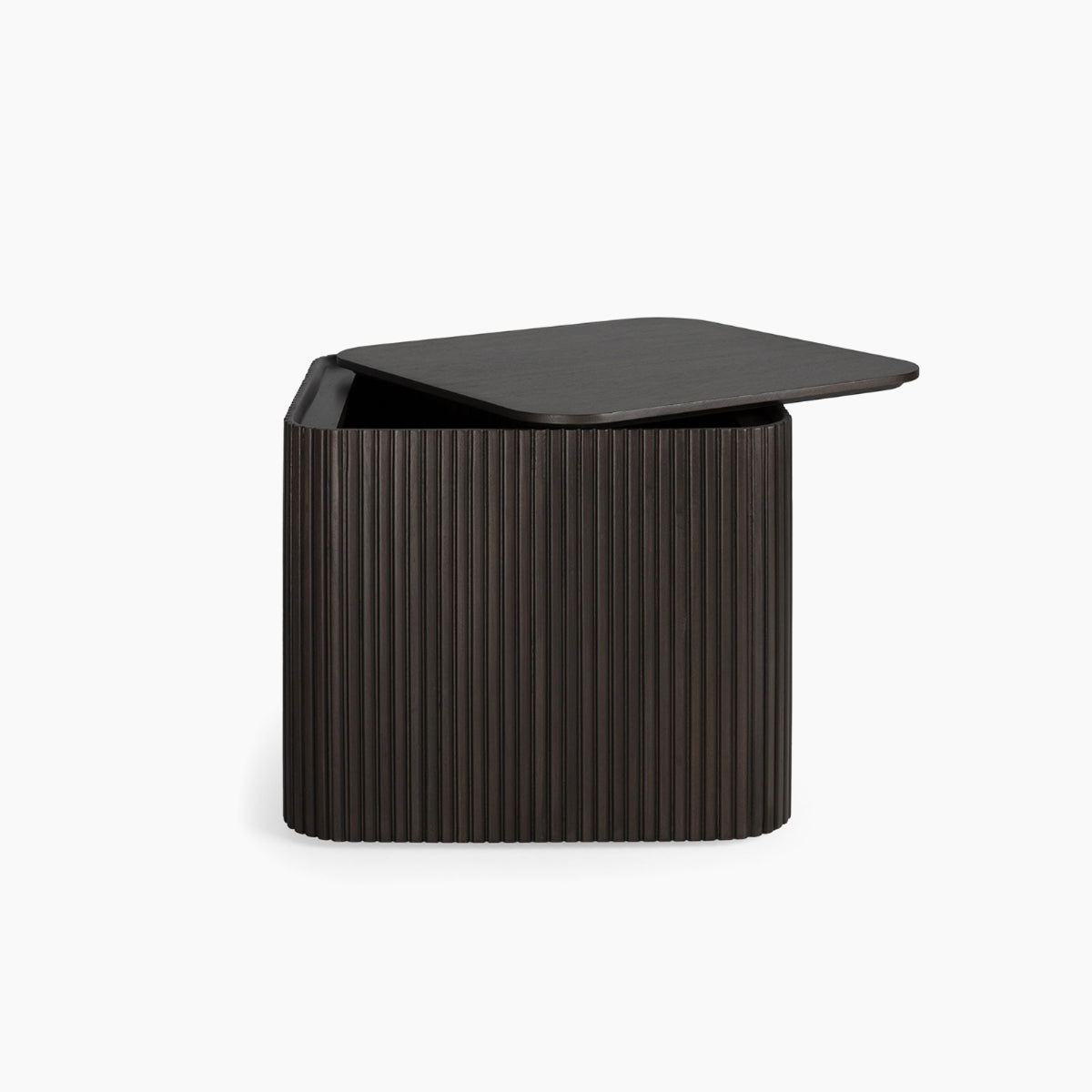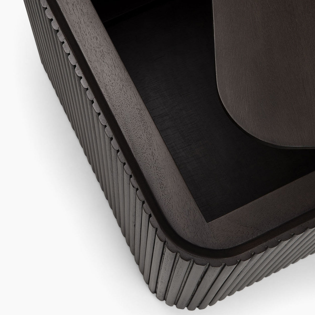 Square Dark Brown Roller Max Table from Ethnicraft with rounded edges. Made of varnished mahogany wood. It is distinguished by a removable top under which there is a capacious storage. The side walls of the table emit rungs that perfectly match the delicate texture of the table top. Mahogany wood is hard, durable and resistant to weather conditions.